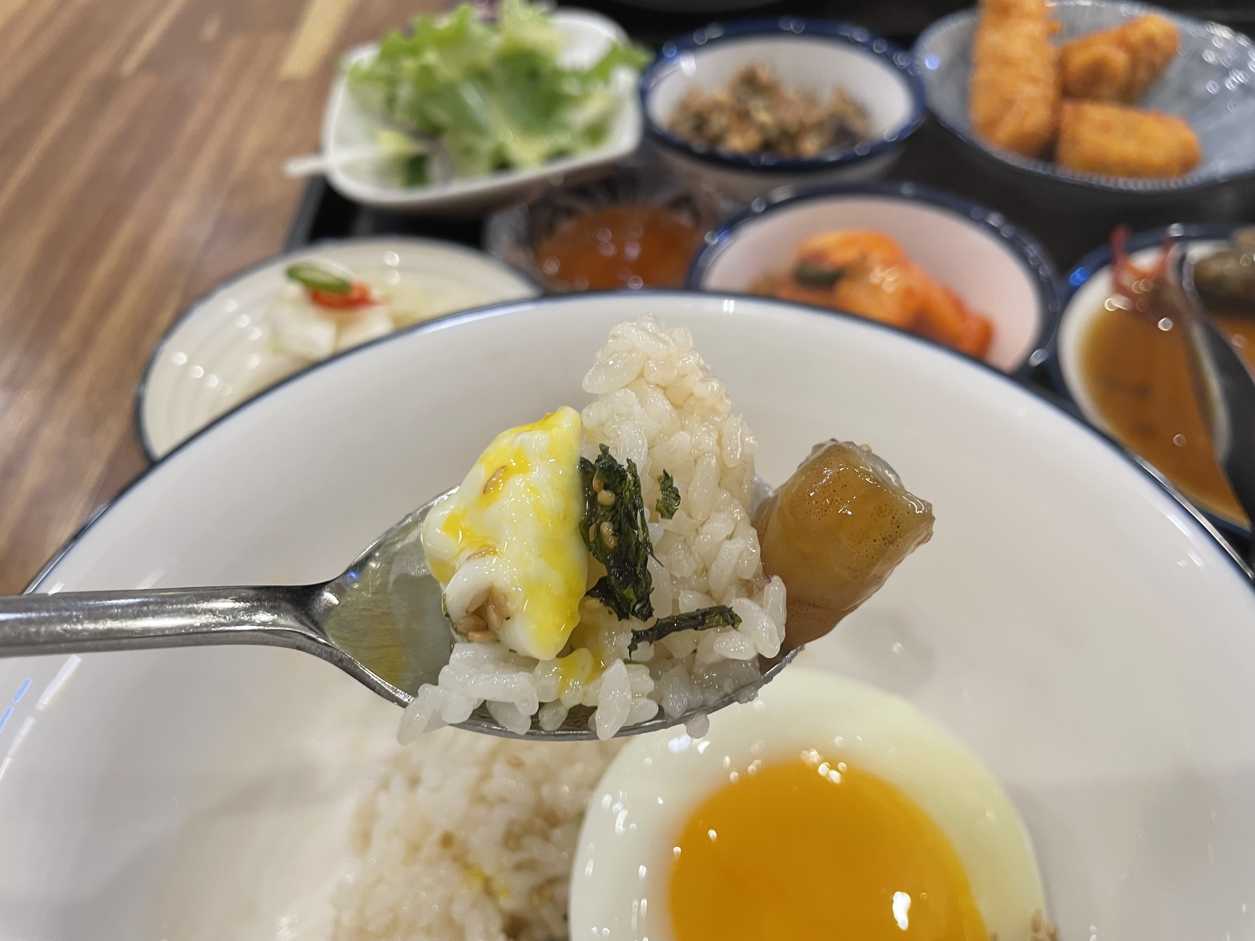 비주얼이 정갈하고 구성이 너무 알차다. 계란밥에 참기름 냄새가 솔솔 올라와 식욕을 돋운다.