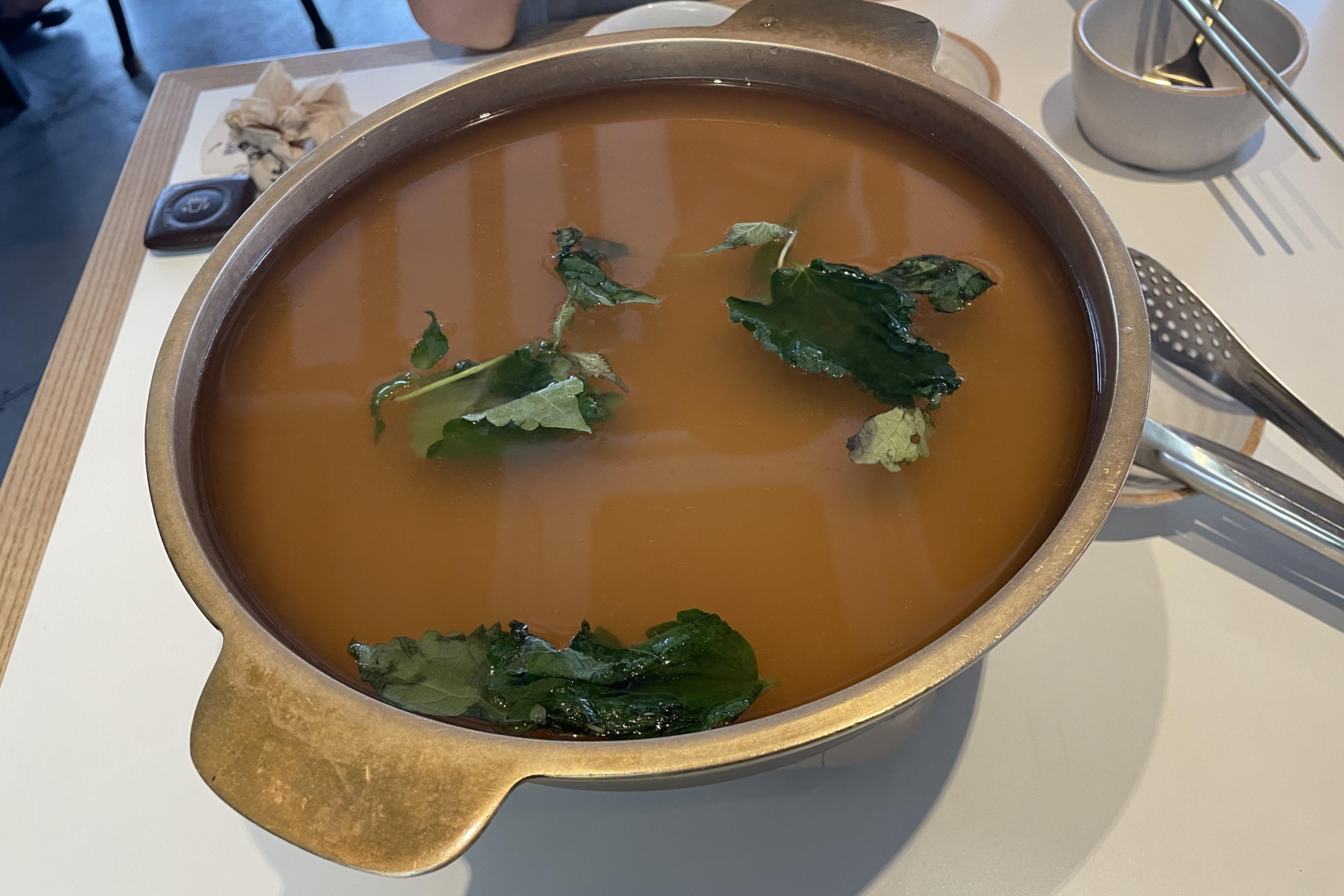 정갈하고 예쁜 플레이팅으로 샤브샤브 재료가 나왔다. 방아 샤브샤브라고 되어있어서 뭘까 궁금했는데 냄비에 육수와 방아잎으로 추정되는 잎들을 넣어 주셨다.