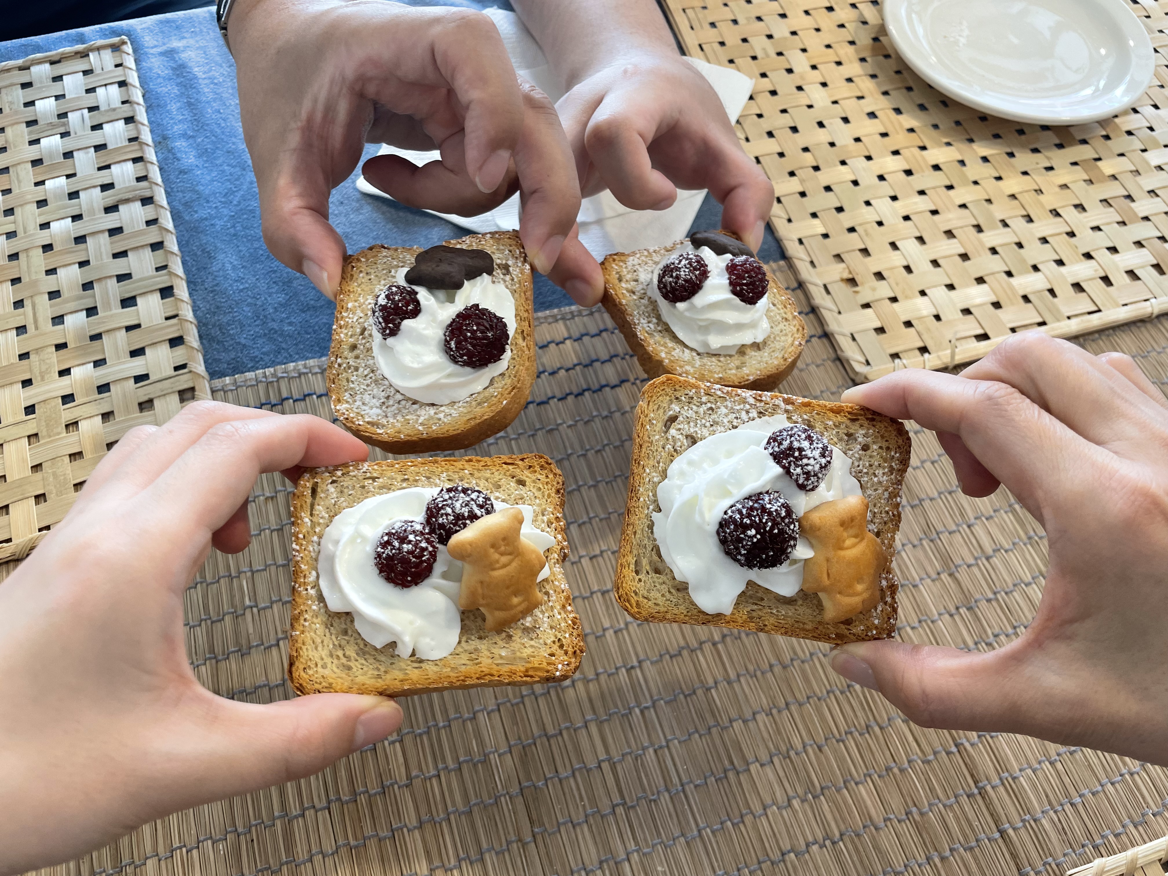 식빵러스크 같은 맛에 생크림과 라즈베리? 그리고 곰돌이 건빵 같은 게 올라가 있는 후식!