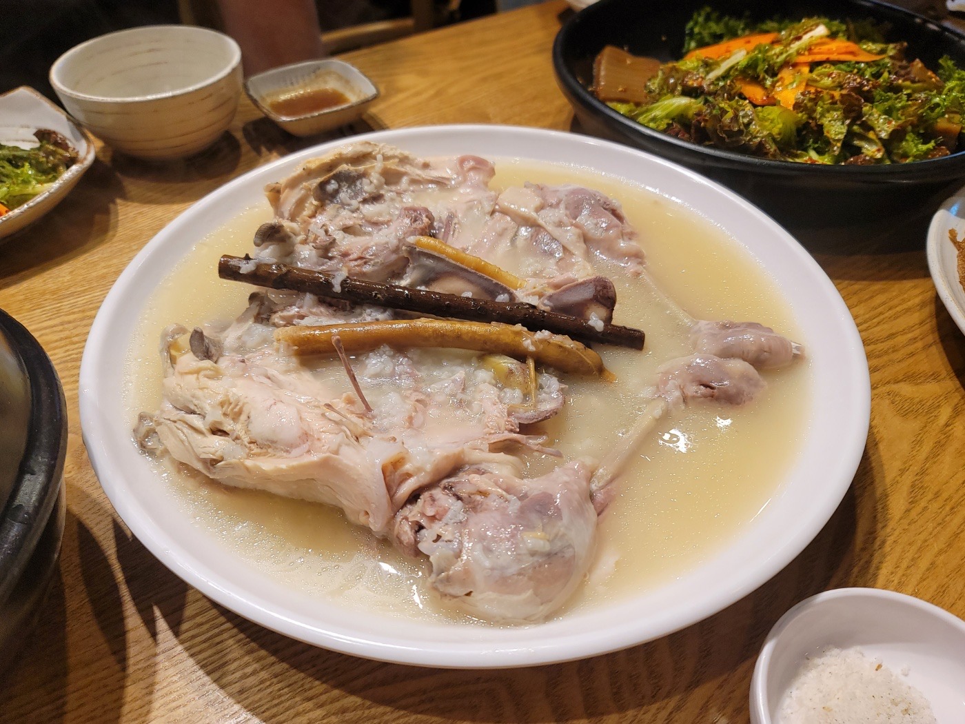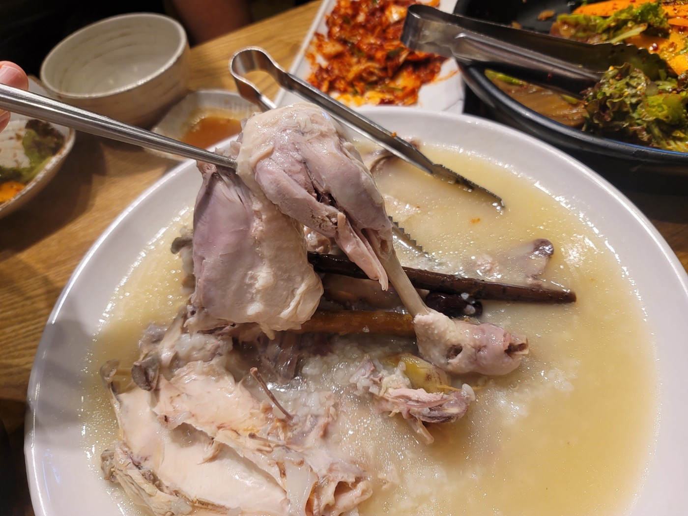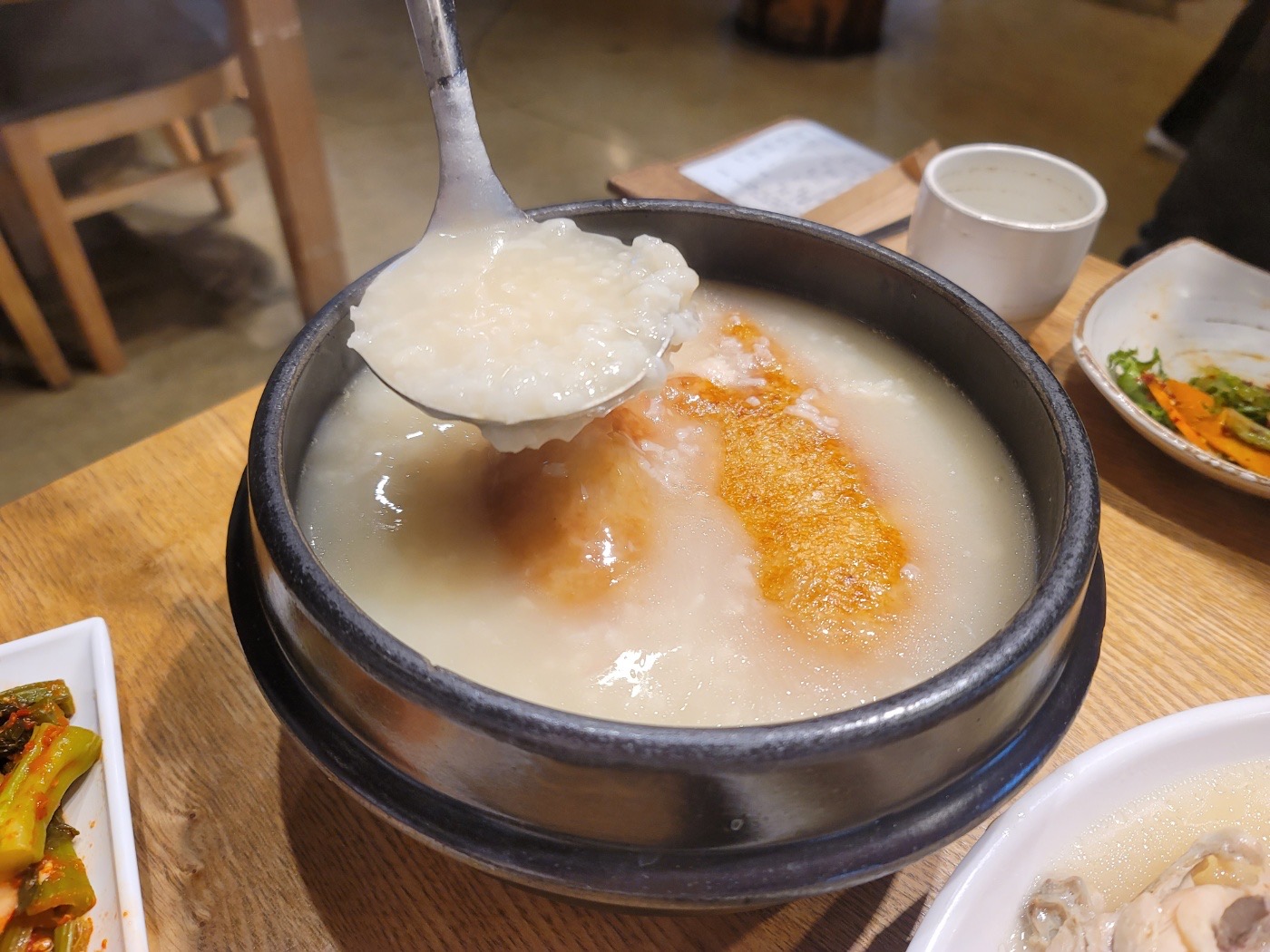 주문할 때 계속 직원분이 셋이서 누룽지백숙 하나만 먹어도 충분하다고 하셨었는데..! 닭은 3인이 먹기에 너무 많아서 많이 남길 정도는 아니었고, 누룽지죽이 양이 진~짜 많아서 다 못 먹는 양이었다. 누룽지 죽에 간이 안되어있다 보니 조금 물려서 다 먹기는 힘든 것 같다.