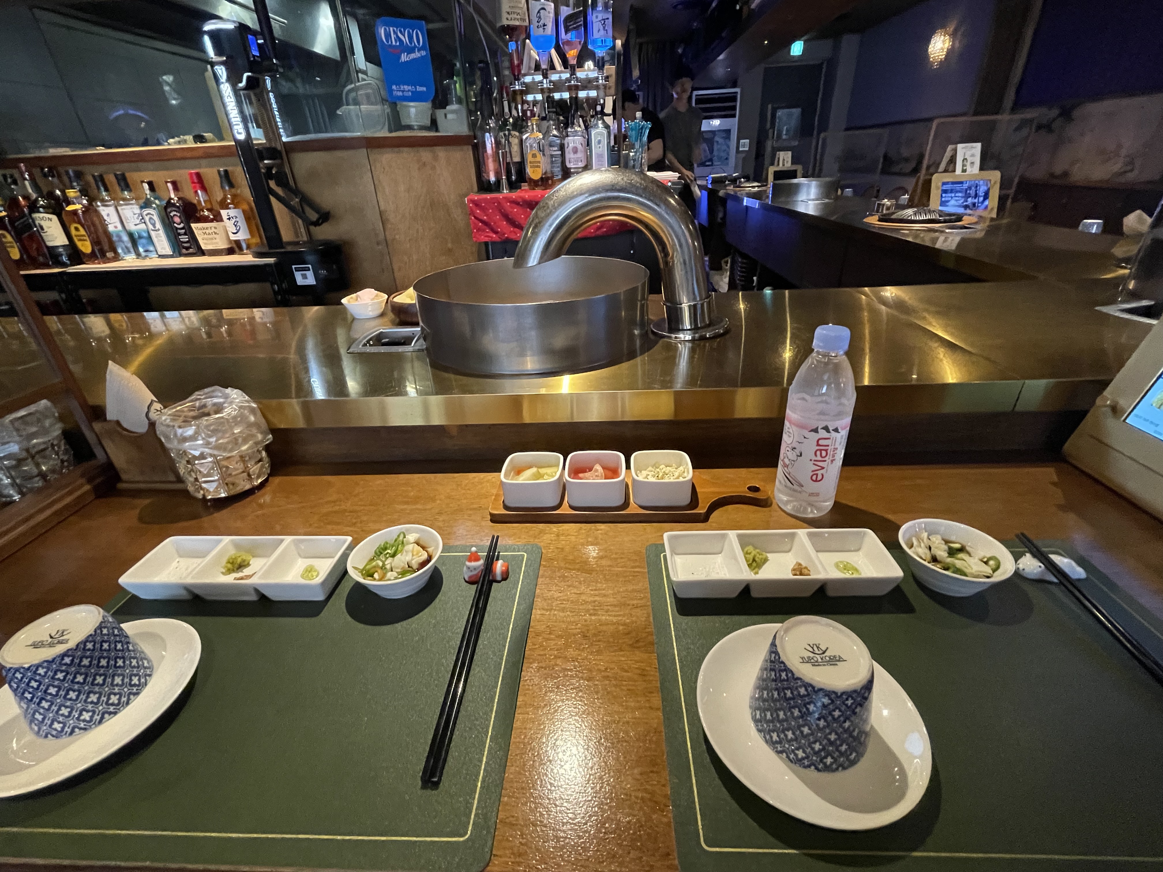 바 테이블 양옆에 투명 칸막이가 설치되어 있고, 바로 앞에 미니 화로에서 고기도 직접 다 구워주신다.