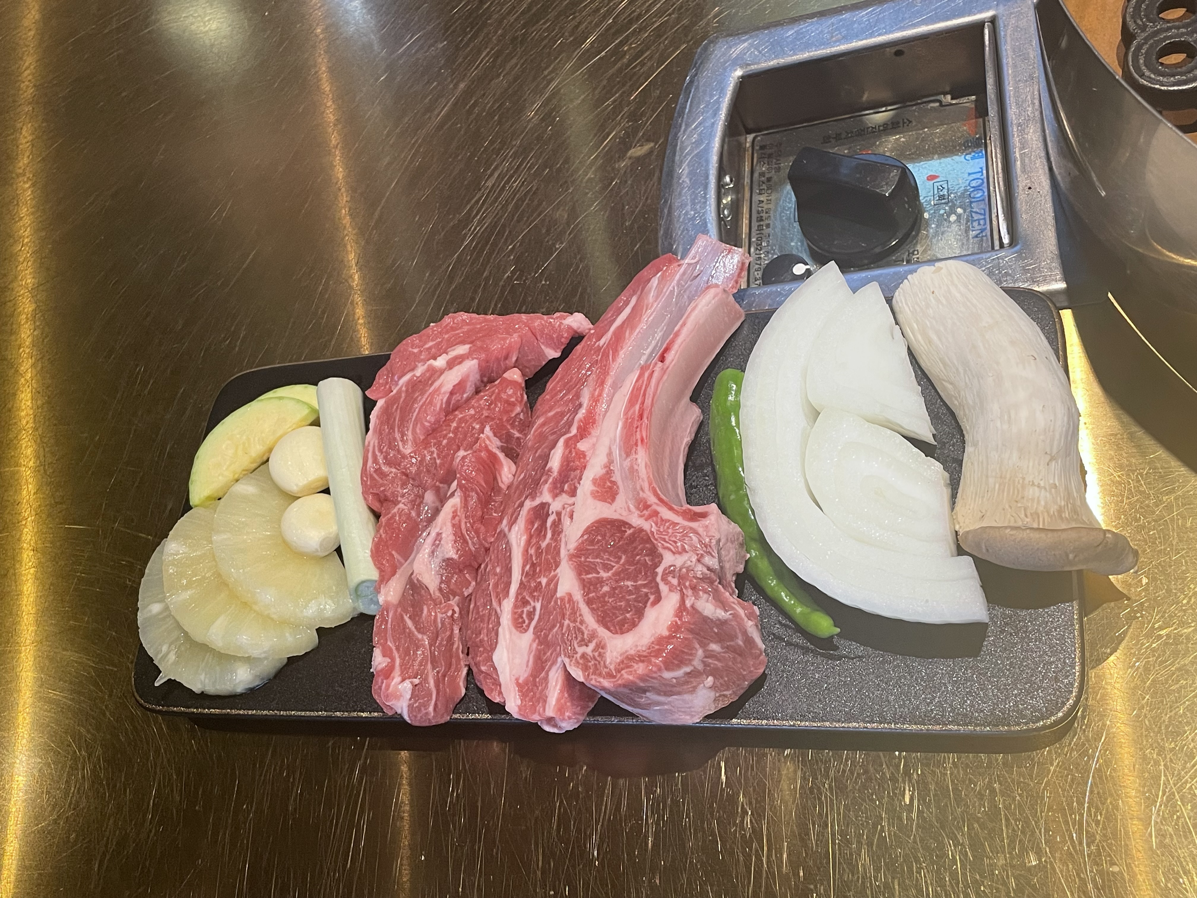 우리는 양 모둠 볶음밥 세트 2인을 시켰다. 양 모둠 고기(숄더랙, 프랜치랙, 양등심) 2인과 숙주야채볶음, 양 볶음밥이 나오는 구성이다.