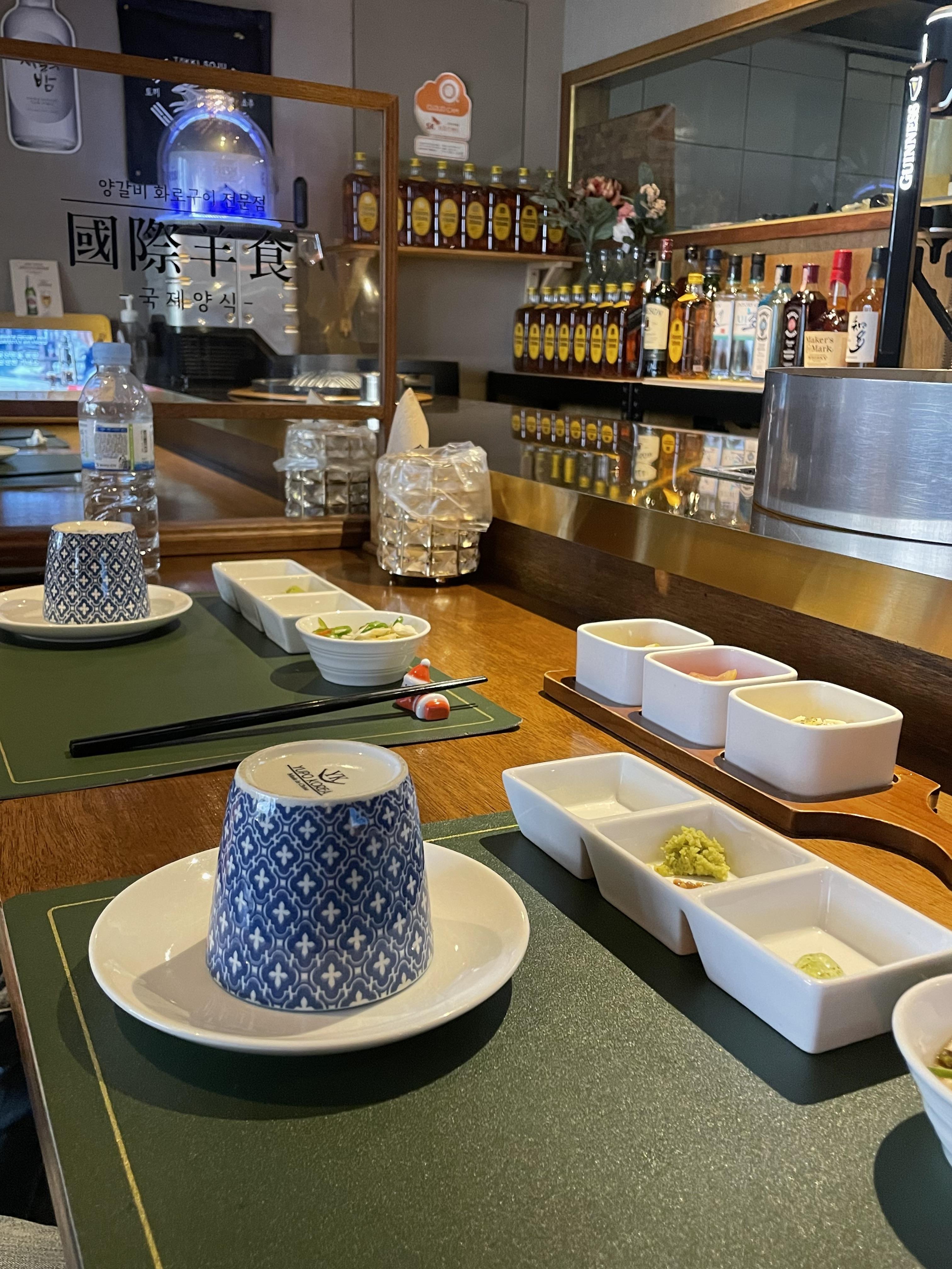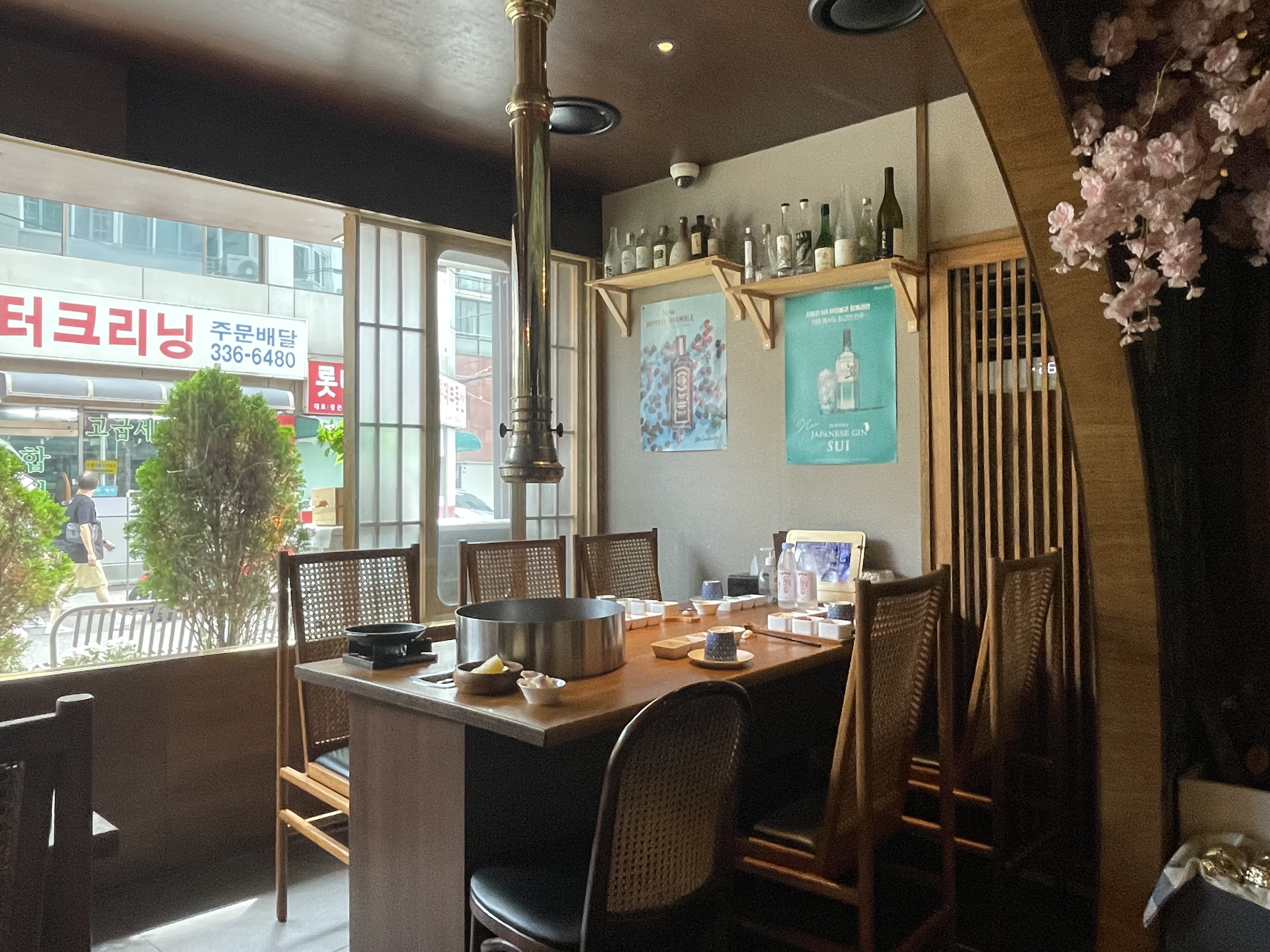 바 테이블 양옆에 투명 칸막이가 설치되어 있고, 바로 앞에 미니 화로에서 고기도 직접 다 구워주신다.
