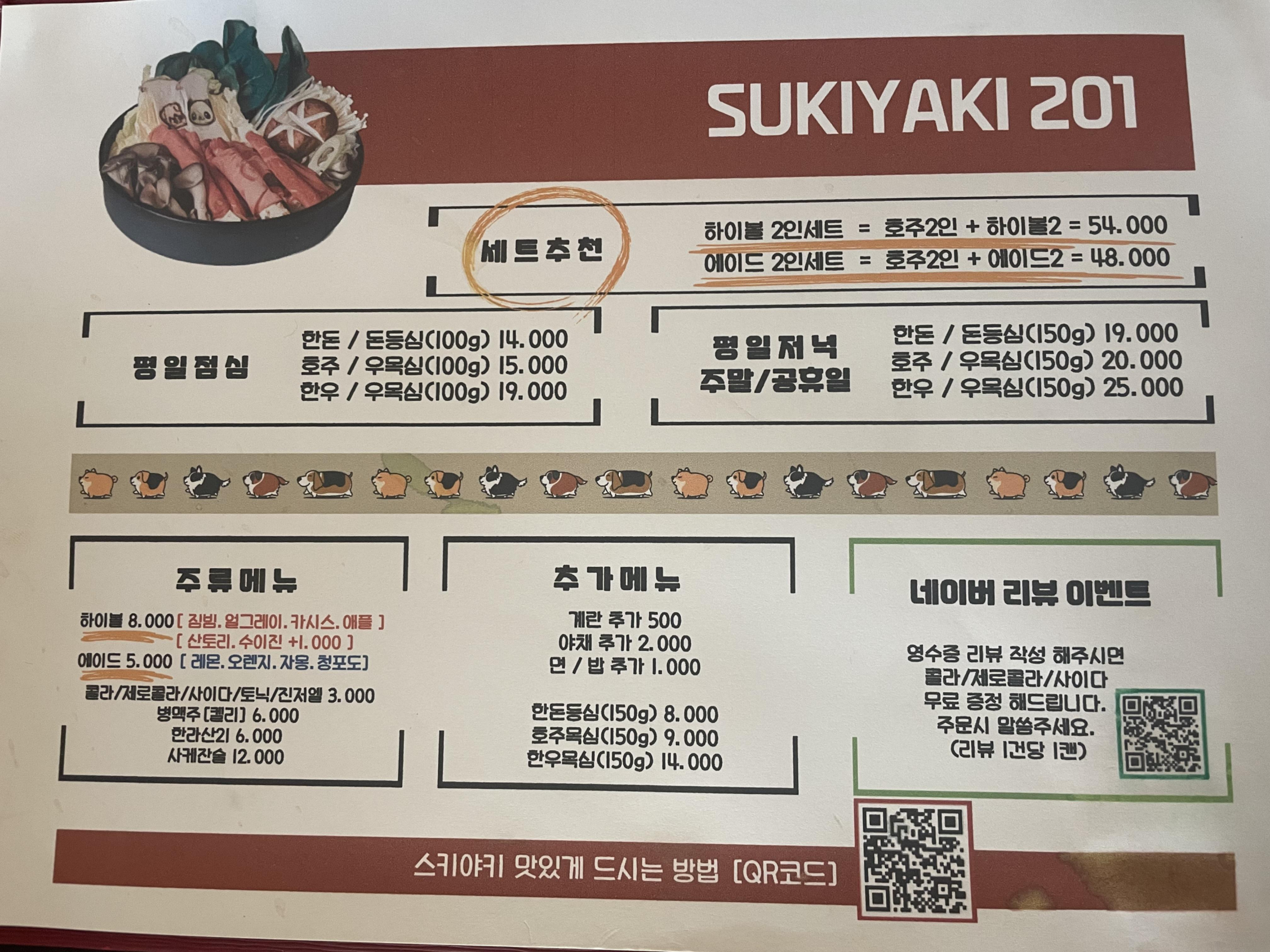 마침 자주 가는 합정 쪽에 분위기 좋고 맛도 좋다는 리뷰가 자자한 <스키야키201>을 발견해서 다녀왔다.