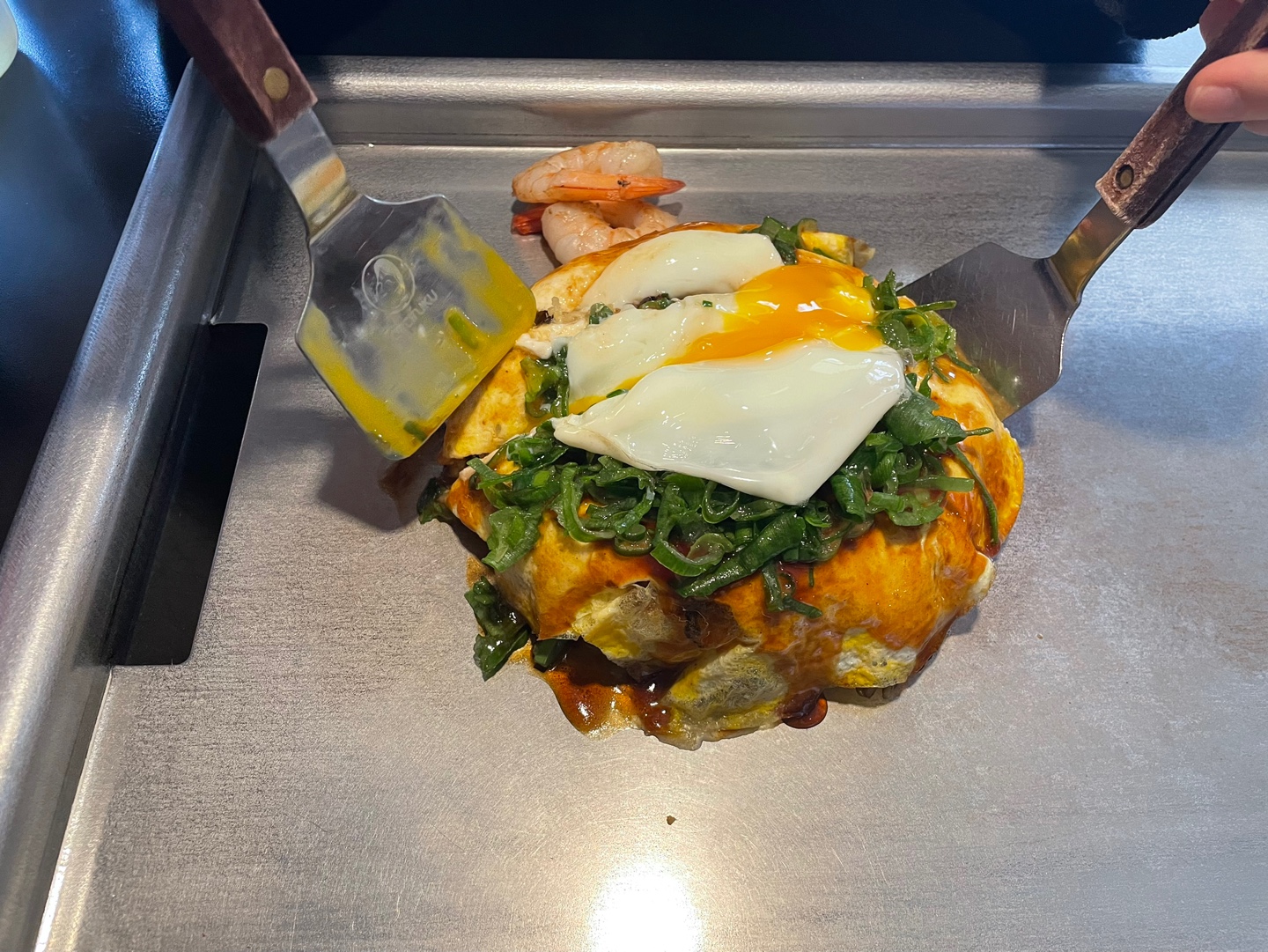오꼬노미야끼가 동그랗고 오동통하고 참 예뻤다. 새우 토핑 추가가 2,000원이었는데 통통하고 큼직한 새우 두 마리가 나왔다. 한 마리당 1,000원인 셈이다..! 음식은 다 만들어져 나와서 바로 먹을 수 있었다.