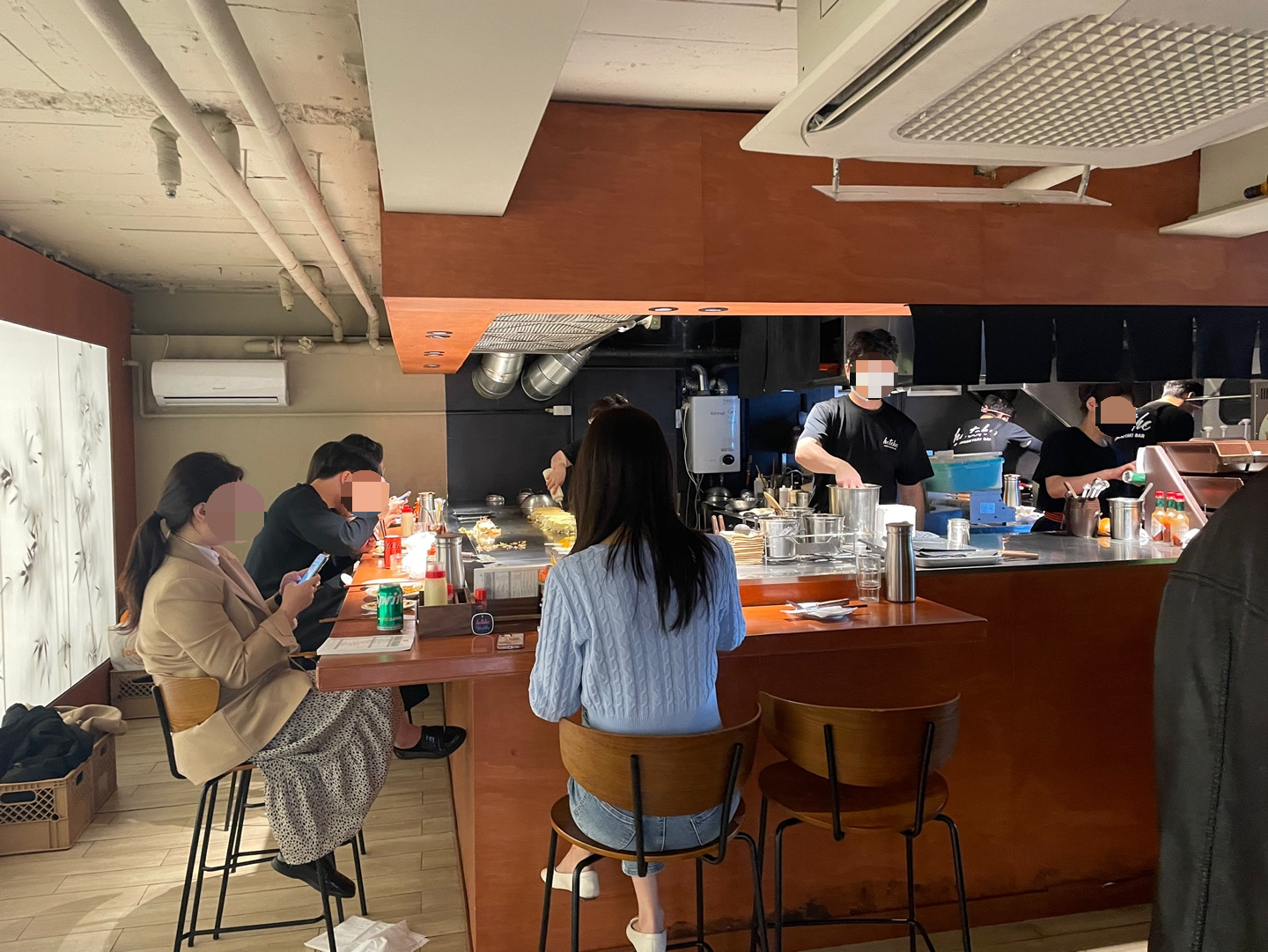 내려가자마자 보이는 철판 바로 앞 바형 자리는 인기가 많아서 앉을 수 없었다. 바로 앞에서 오꼬노미야끼와 야끼소바를 볶아주시는 것을 먹으면, 보는 재미도 먹는 재미도 두 배일 것 같다.
