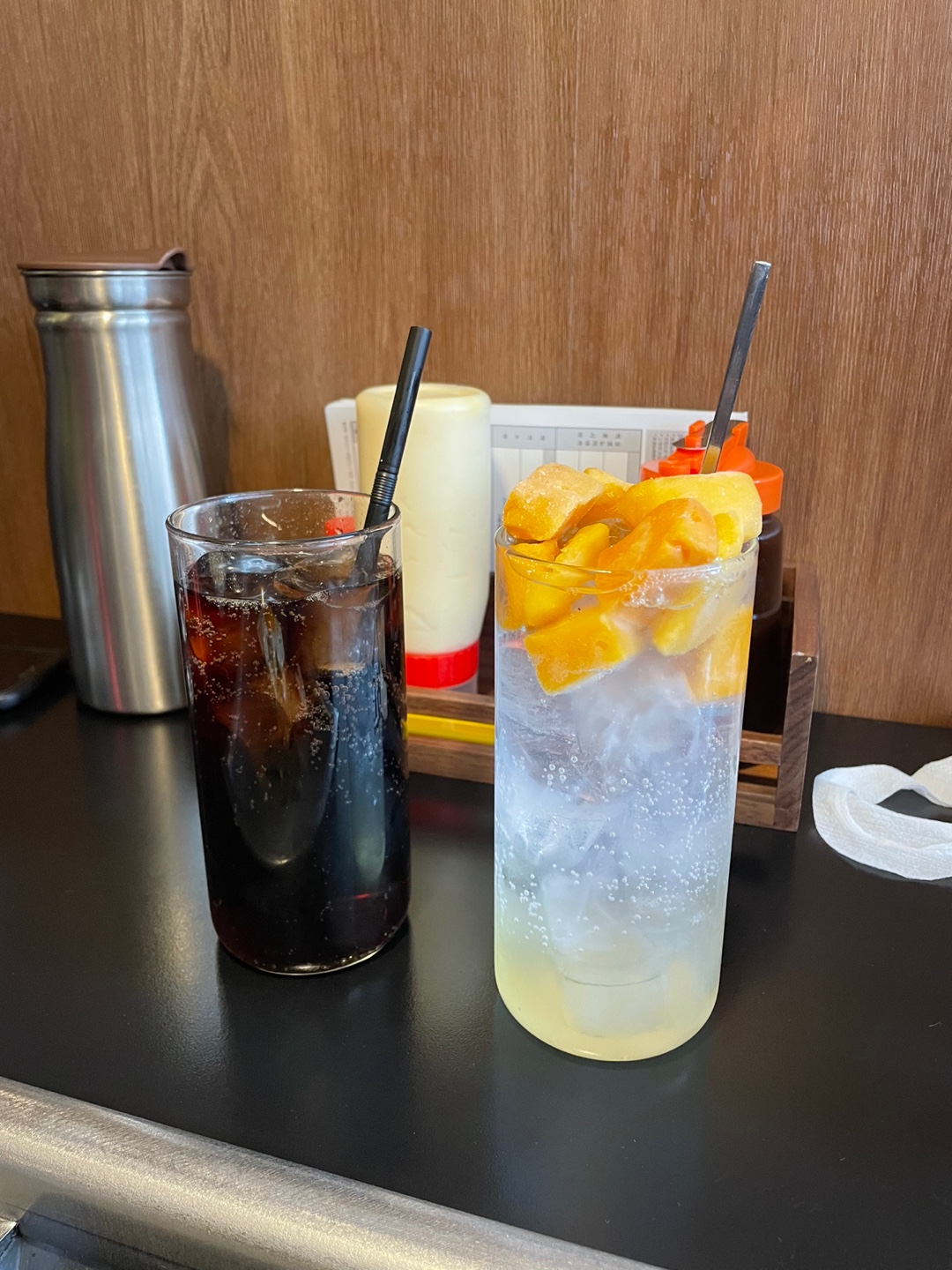 우리는 핫쵸 히로시마 오코노미야끼와 칸조 야끼소바, 망고 츄하이를 시켰다.