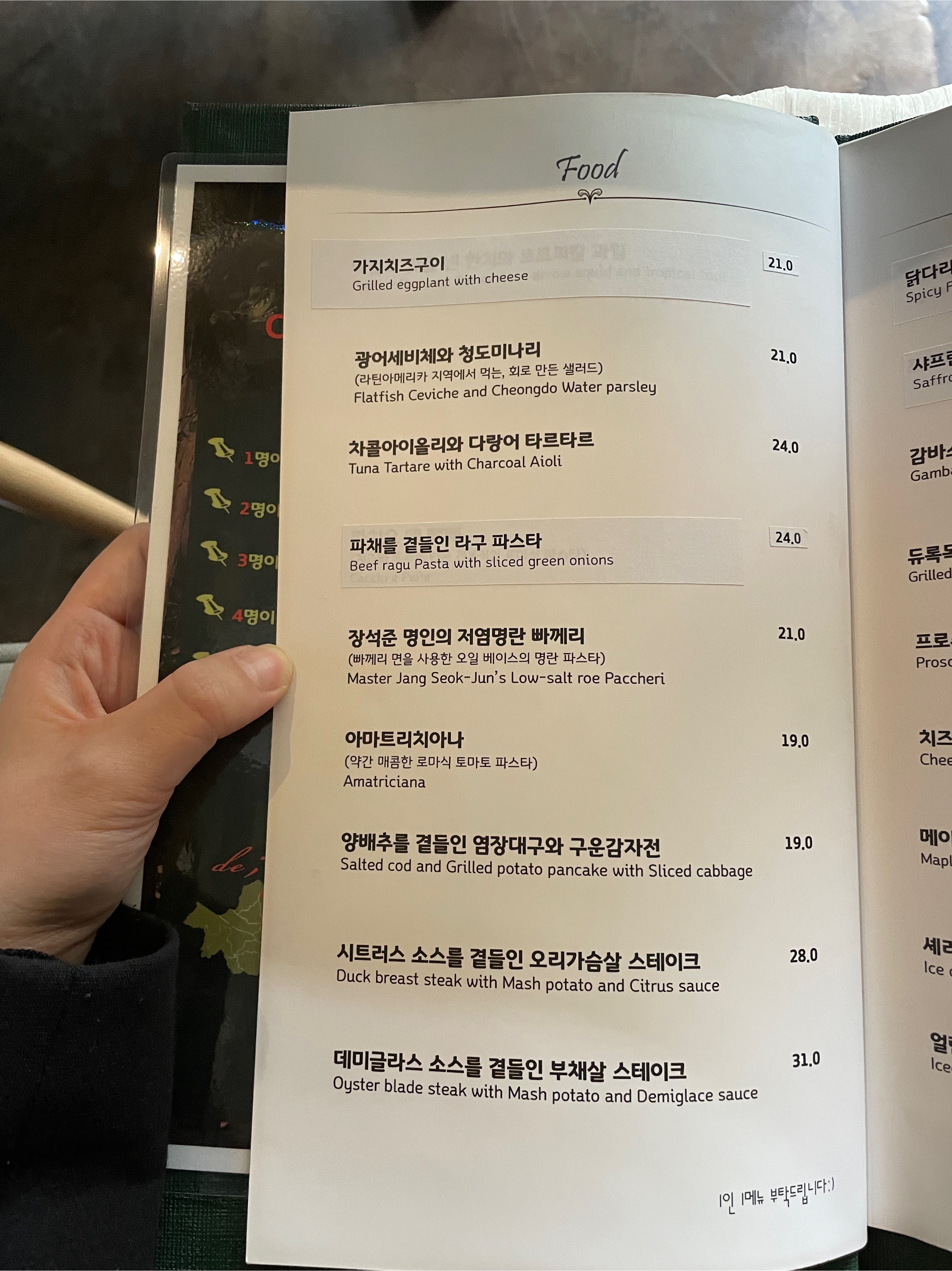 우리는 리뷰에서 평이 좋았던 오리가슴살 스테이크, 저염명란 빠께리, 파채를 곁들인 라구 파스타를 시켰다.